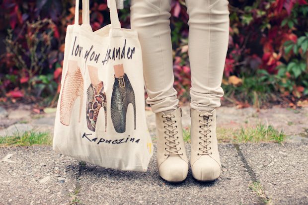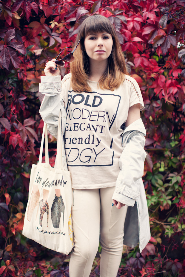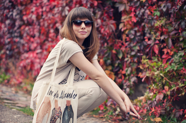 Today’s post is maintained in bright colours. Dominant are beige and grey. The bag is a gift from Magic Box. It was made according to my project. Szymon (my invaluable photographer) helped me with graphics creation. It’s wonderful to have something such unique. 'I love you Alexander’ is my little tribute to the deceased designer.
