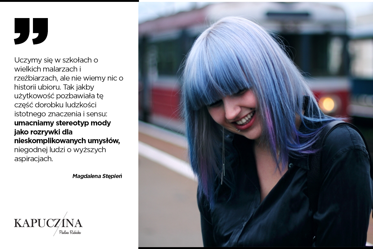 Mamy tendencję do lekceważenia mody, traktowania jej jak „tylko ciuchy”, a takie wypowiedzi tylko do przekonanie umacniają. Nie posiadając wiedzy, nie jesteśmy w stanie ocenić jej znaczenia w kontekście zachowań społecznych, jej wpływu na gospodarkę światową, jej znaczenia dla historii sztuki. Nie potrafimy spojrzeć na kreację z wybiegu jak na dzieło, efekt pracy artysty, widzimy w niej tylko coś, co dałoby się nosić po ulicy lub nie. Lubimy wtedy często przywoływać wyświechtane cytaty z Coco Chanel i powoływać się na Audrey Hepburn, dopieszczając się truizmami o nieśmiertelnej klasyce. Koniec końców chodzi po prostu o to, że mody nie rozumiemy, traktujemy ją jednoaspektowo, tak samo jak nie potrafimy odróżnić mebli marki Bodzio od skomplikowanego wzornictwa na targach designu.