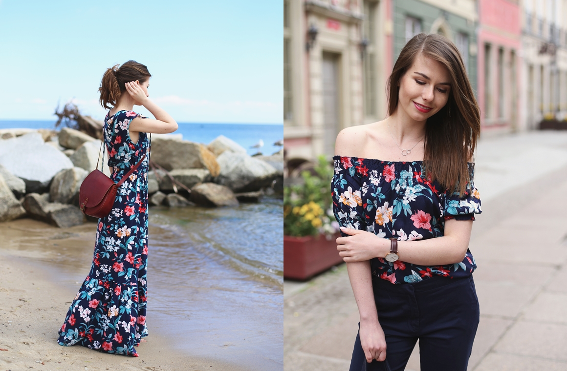 Wprawne oko zauważy, że wzór na bluzce oraz sukience jest identyczny. Byłam ciekawa, jak sprawdzi się w miejskiej stylizacji oraz wersji bardziej wakacyjnej, nad morzem. Kwiaty to jeden z najbardziej popularnych motywów, pojawiających się w letnich kolekcjach. Mają tyleż zwolenniczek, co przeciwniczek. Wbrew pozorom nie należą wcale do najłatwiejszych trendów. Zdarza się, że wyglądają zbyt słodko albo pstrokato. Z sukienką maxi sprawa jest wprawdzie ułatwiona – wystarczy dopasować brakujące dodatki. Z czym jednak połączyć wzorzystą bluzkę? W tym przypadku sprawdziłyby się jeansy albo – bezpieczna opcja, którą wybrałam – chinosy w tym samym kolorze, co bluzka. Dajcie znać, która odsłona kwiatowego printu podoba Wam się bardziej!