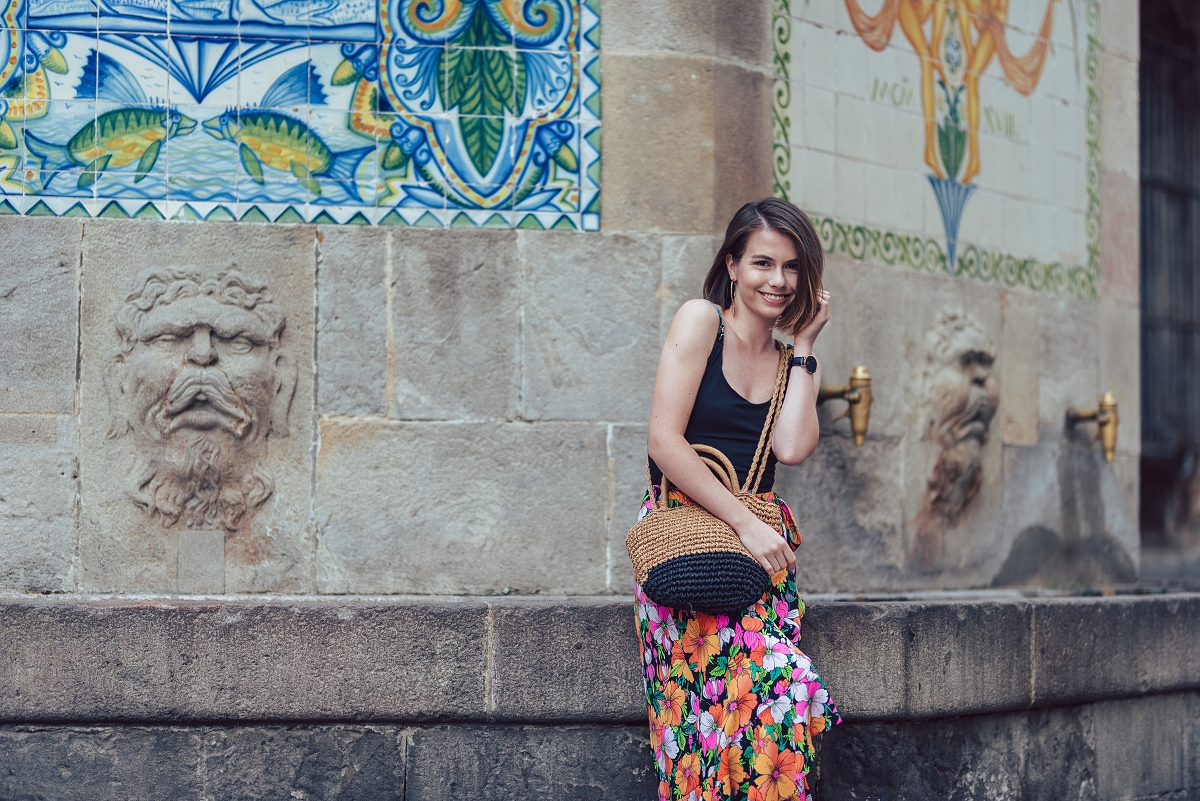 To już moja ostatnia stylizacja z Barcelony. Fotografowaliśmy ją o wschodzie słońca. Jestem książkowym przykładem nocnego marka, więc takie poranki są dla mnie nie lada wyzwaniem. Z drugiej strony, to właśnie podczas wschodów i zachodów słońca światło jest najpiękniejsze. Budowla, która widzicie na zdjęciach, to Katedra Świętej Eulalii – jeden z najcenniejszych zabytków architektury gotyckiej w Hiszpanii. Znajduje się na terenie Dzielnicy Gotyckiej. O bardziej ludzkich porach są tutaj tłumy turystów. Wspaniale zobaczyć miasto z nieco innej perspektywy, ciche, spokojne…