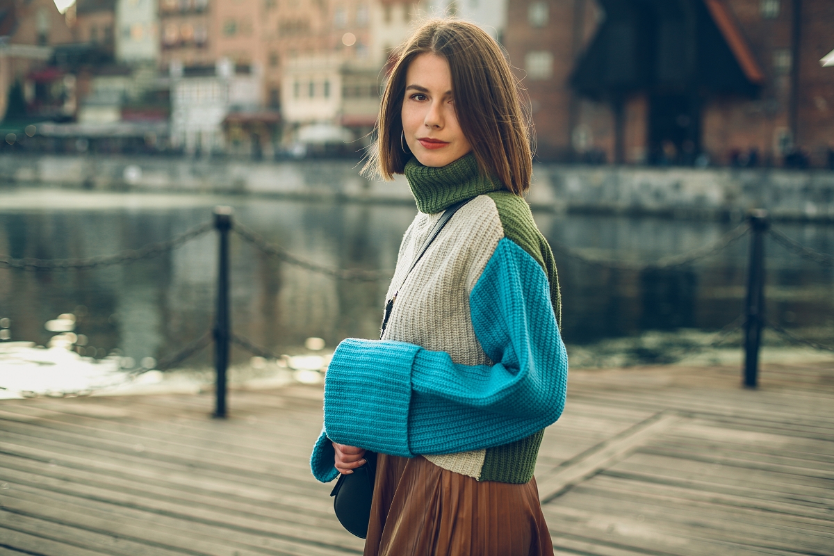 Powinniście dać mi bana za publikowanie kolejnej stylizacji z golfem. Ten rodzaj swetra od kilku miesięcy towarzyszy mi niemal codziennie. Bardzo polubiłam też trendowe połączenie niebieskiego i brązu. Nie jestem jednak osobą, która biegnie do sklepu tylko dlatego, że coś jest modne w danym sezonie. Częściej odkopuję z szafy stare rzeczy i z uśmiechem na twarzy stwierdzam, że nosiłam je kilka sezonów temu, więc wyprzedziłam trendy.
