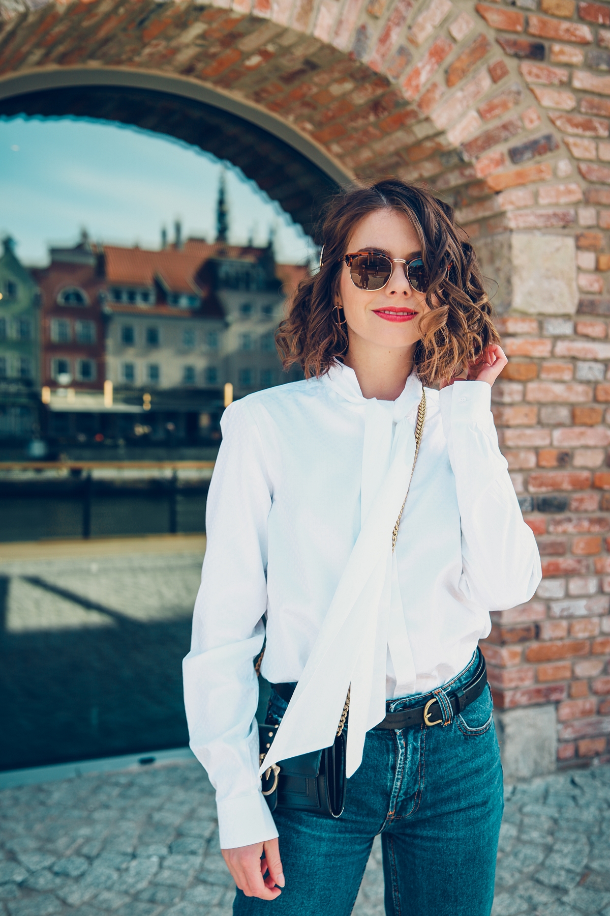 Lubię łączyć szykowne rzeczy z tymi bardziej casualowymi, dlatego też do białej koszuli dobrałam mój ulubiony fason jeansów – mom jeans. Podczas ostatnich warsztatów w Forum Gdańsk na temat slow fashion jedna z uczestniczek zadała mi pytanie, o to jak godzę jakościowe podejście do mody z najnowszymi trendami. Odpowiedziałam wtedy, że traktuję trendy drugorzędnie. Chętnie po nie sięgam, ale nie wymieniam ubrań tylko dlatego, że w danym sezonie modniejszy jest inny fason czy kolor. Tego lata to jasny jeans będzie wiódł prym. Nie oznacza to jednak, że powinnyśmy pozbyć się wszystkich spodni w ciemniejszym odcieniu.