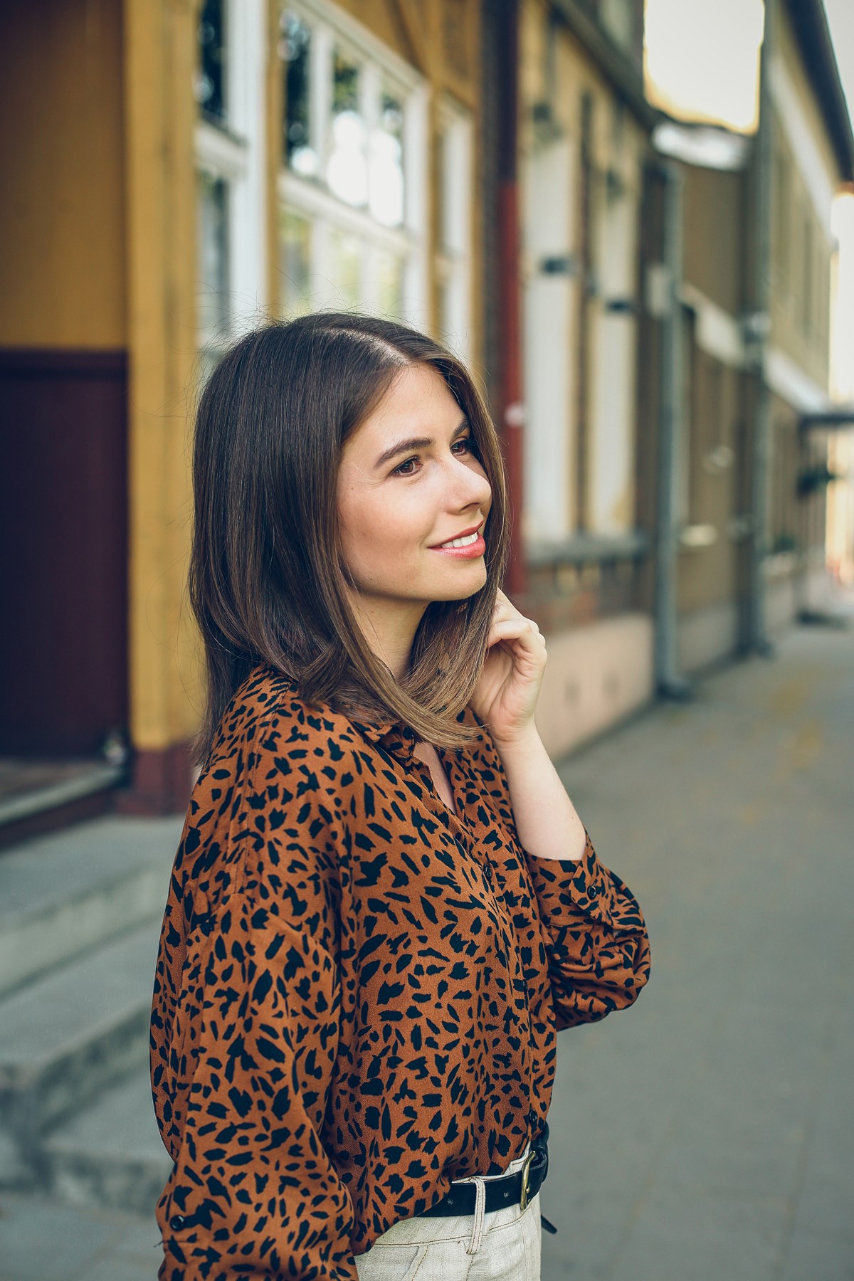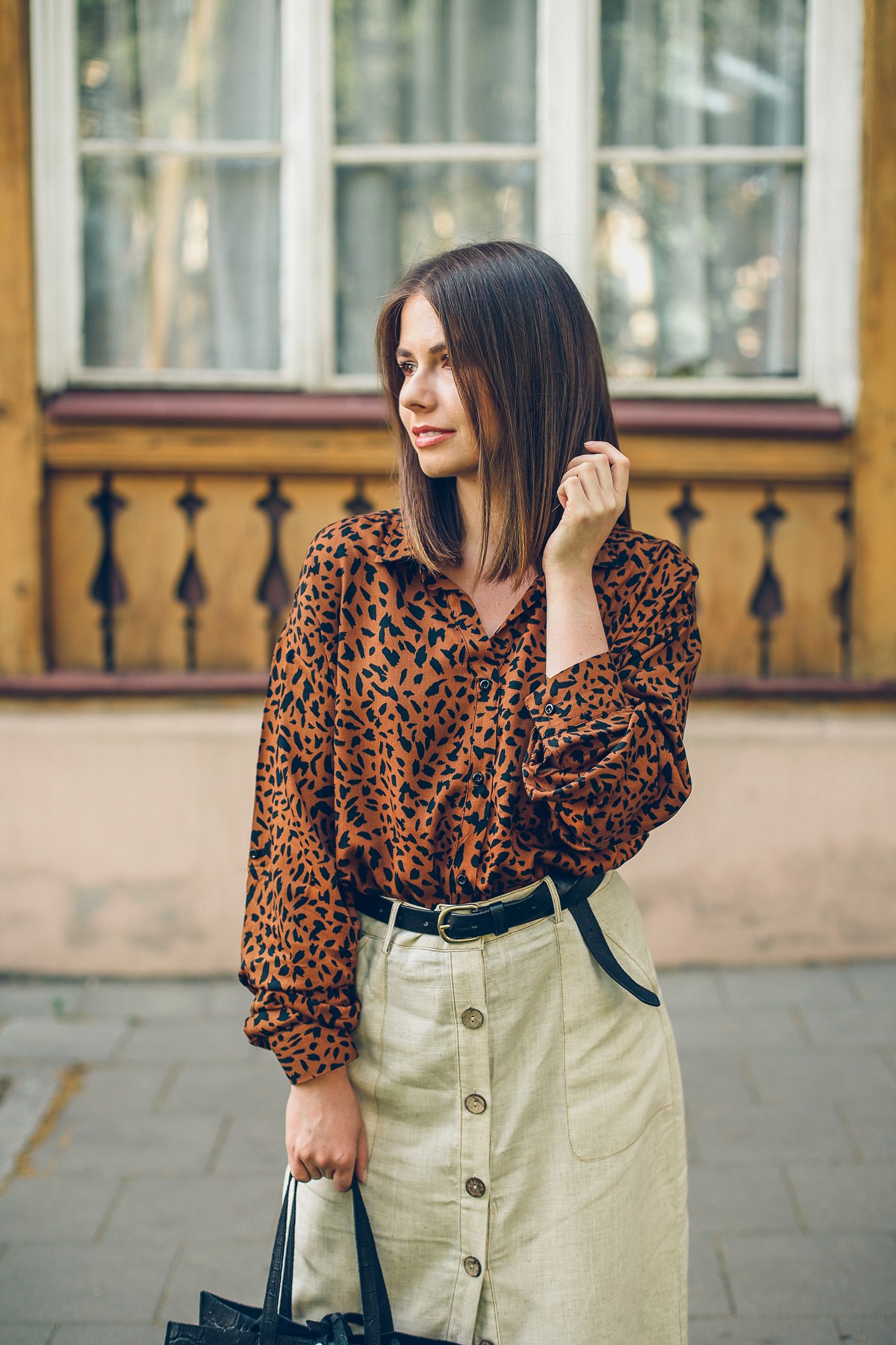 Mój dzisiejszy look w całości skomponowałam z oferty Answear.com – ich marki własnej. Nawiązuje do stylu safari, z którym tego lata jest mi wyjątkowo po drodze. Zacznę od koszuli. Na pierwszy rzut oka wygląda, jakby była w panterkę. Jeśli przyjrzeć się jej bliżej, nie są to jednak cętki. Na zdjęciach w sklepie koszula prezentowała się świetnie, ale bałam się, że w rzeczywistości wzór może być zbyt krzykliwy. Moje obawy okazały się zupełnie bezpodstawne. Jej jedyny minus to brak nadruku na wewnętrznej stronie rękawów, co utrudnia ich podwijanie.
