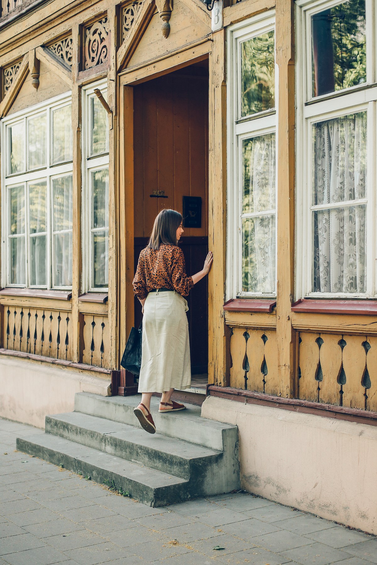 Jeśli zaś chodzi o spódnicę, ten fason chodził za mną od jakiegoś czasu. Miała być lniana, zapinana na guziki, biała lub beżowa, koniecznie długości 7/8. Spódnica Answear ma tylko 30% lnu, ale reszta to wiskoza, wiec zachowuje swoje właściwości. Wybrałam też torbę ze skóry naturalnej z wężowym tłoczeniem o surowej, minimalistycznej formie oraz najwygodniejsze na świecie sandały, w których czuje się jak w miękkich kapciach!